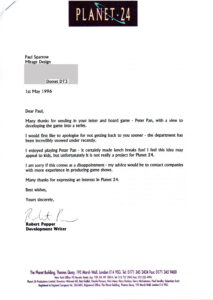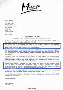 After the 1995 reform, Sparrow continued pushing his Peter Pan Adventure Game forward. In January 1996 he submitted a proposal to transition his board-game into a TV game-show — sending out copies of the board-game to accompany his proposal to multiple parties, including the BBC, ITV, LWT, Planet 24, Action Time, Mentorn, and several others.