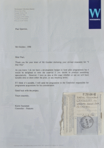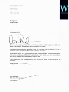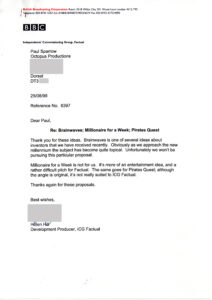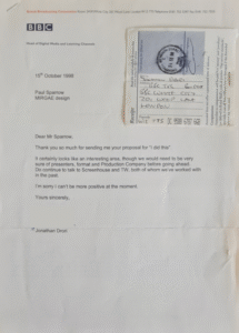Each variant was submitted to broadcasters in their respective development years, and one of the following 1998 reply later resulted in a meeting at BBC HQ in May 1999, and the show almost got picked up by BBC2 for March 2000, for their Millennium schedule.