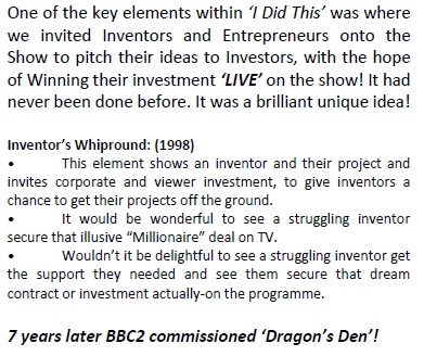- the first “live pitch” concept ever proposed for television, later forming the format of the BBC’s Dragons’ Den (2005), the US Shark Tank (2009), and other derivatives around the world, starting with Money Tigers in Japan (2001).